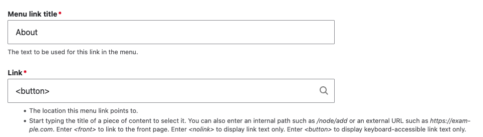 - No items should have <front> as their Link unless they are meant to link to the front page.